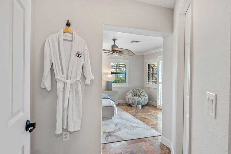 From the intersection of 520 and A1A (right by Ron Jon’s Surf Shop), you will head southbound approx 1 mile just past the Publix Banana River Square Center to the traffic light at S. Banana River Blvd. Make a right on S Banana River Blvd and yield right at the split. It will dead-end into Saint Croix Ave. Look for the blue tile roof halfway down on the left.